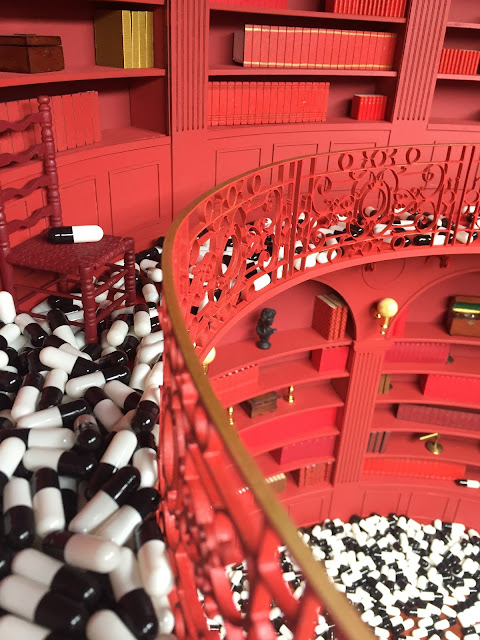 Here are a few photos from Shoot number 2. 'The Red Room.' This shot features a cascade of pills falling in slo-mo through a psychiatrists library set.